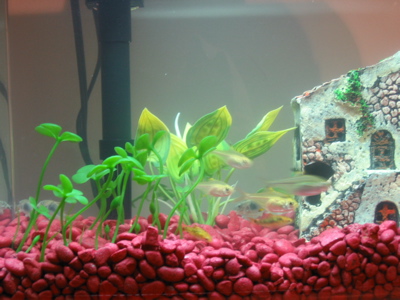 Well, after 2 weeks I still don't see any trace of nitrites in the water so it seems like our ammonia-munching bacteria hasn't really taken hold yet. Getting rather impatient here. =p But at least the fish don't seem to care and we haven't lost another one since the last entry. One of the cories seems to have taken into hanging out inside the house. If he goes and croaks in there we won't know for quite awhile. At least all the fish seem to have their appetites as they go into a frenzy when we feed them. Especially the cories; watching them squirm around is hilarious.
