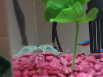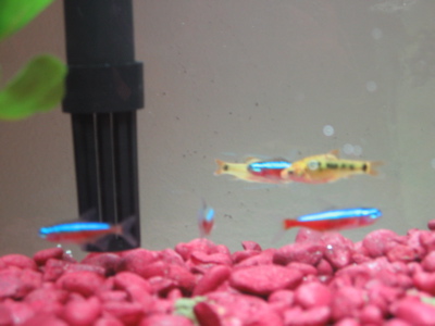 It's a good thing that the store employee noticed that we were buying the tank that day cause we didn't know that we had to take the tank home and let it run for a day first before actually putting fish into it. So that's what we did. This afternoon we went to the local mall pet store to pick up some of your typical tropical freshwater fish. Wound up with the four remaining cardinal tetras that the store had along with two gold barbs and two bronze catfish. I'm thinking we're gonna need a bigger tank pretty darn soon.