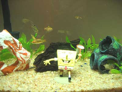 This is a slightly closer view of the four main decorations we have in the tank. Spongebob was Erin's idea. =p The chunk of wood behind Bob actually has a lot of cracks in the middle that our two