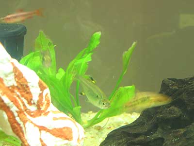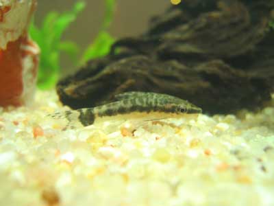 oto. They are algae eaters and have a big sucker-like mouth. They usually cling to any vertical surface in the tank but also seem to hang out on the gravel every now and then. The interesting thing is that they seem to cling to the vertical surfaces not with their mouth which I had originally thought, but with their pelvic fins. Which is pretty impressive cause those fins aren't all that big. Anyway, we have two in the tank to help with any algae that might start growing. They seem to be mostly active when the lights go down.