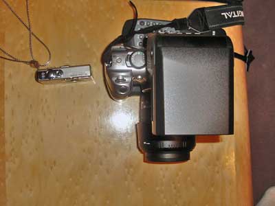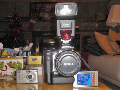 So I got a bunch of accessories for my Canon Digital Rebel this Christmas and was a bit astounded by the final "look" of it after I added all the new goodies to it. Especially compared to our relatively newer Canon Powershot SD300. So I took a few pics...