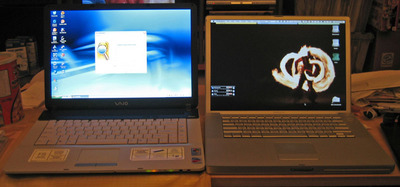 Between the PSP and this Vaio, it seems pretty apparent that Sony's cutting corners every way possible. Not on the actual main products themselves (although a good number of people may disagree when it comes to the PSP), but on the packaging and accessories. While Apple still uses at least styrofoam padding for the laptop boxes, Sony uses cardboard braces in their boxes. And they don't even include backup/reinstall CDs anymore! You have to create your own backup discs first thing otherwise you're screwed if anything happens in the future. Kinda irritating. Anyway, the laptop itself seems pretty well built and should be fun getting to play around with it for the week. My streak of no dead pixels on any LCD screen for any product that I've been the first to open up still stands. =)