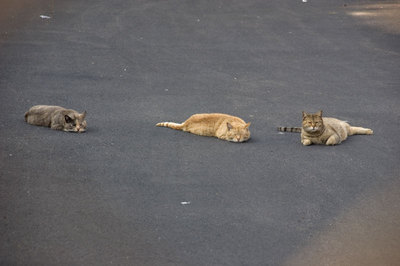 These 3 lazy cats are semi-strays that hang out in the neighborhood. Locals seem to take care of them quite well and they hang out at an outdoor parking lot a block away.