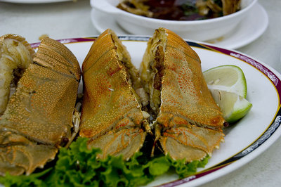 Erin's childhood friend drove us out to Chijin last night for a seafood dinner which was quite fresh, good, and affordable. Many dishes which I was too busy polishing off to take pictures of but we did wind up ordering two of these "mushroom heads" which were pretty good. They're basically lobsters 'cept they look like someone went to town on their heads and flattened 'em with a mallet.