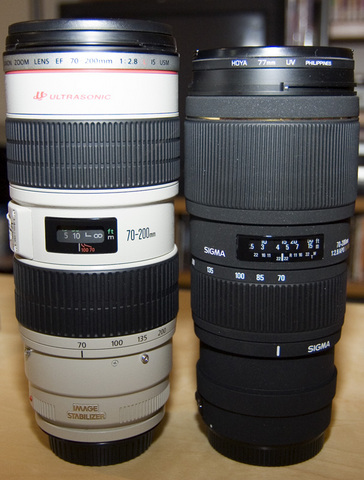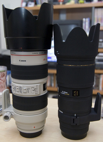 First off, a quick physical comparison. Both lens are definitely not lightweights with the Sigma coming in at 7.2" long and 2.8 lbs and the Canon eclipsing that at 7.8" long and 3.24 lbs, almost half a pound heavier! Doesn't feel too different when you're holding just the lens in your hand but stick that on to your camera body along with a flash unit and you start feeling it after awhile. So using either of these lenses will definitely give you a nice upper body workout.