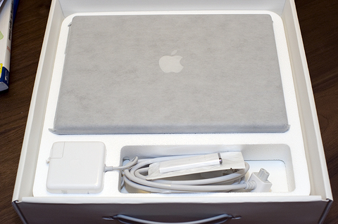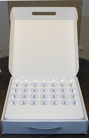 Despite the thin box they haven't skimped on the padding. The MacBook and instruction manual/CDs are protected on both sides by this eggshell crate styrofoam blocks.