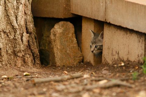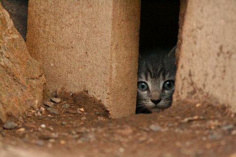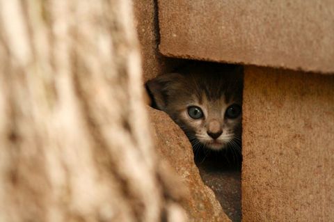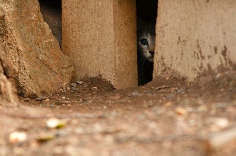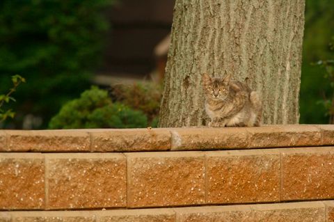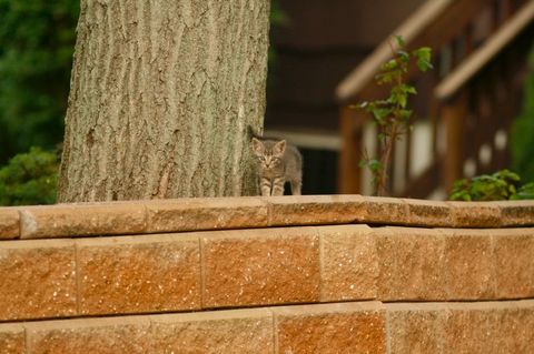 Intrigued, my mother and I took a closer look at our wall back there to see where this family was staying and discovered that there were 2 holes in the back side of the wall where they were hiding out in. Just 2 kittens and their mom. So I camped out on top of the wall a good distance away to see if I could get some shots. This kitten would stick his head out and then duck back in when he caught site of me.