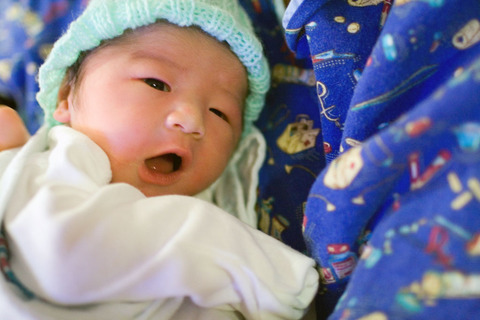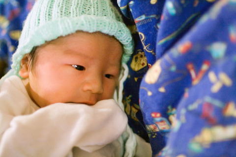 Once the doc had the baby out, it took only one or two seconds for him to start bawling and that just increased as the doc handed him off to the pediatrician (who had come in on standby because they're mandatory if forceps are used) and nurse who immediately rubbed him down with towels, pinched off the umbilical cord, plopped a hat on him, and checked on his overall well-being. While the doc proceeded to remove the placenta and then sew up the episiotomy along with other minor tears, I moved over to take a look at my first son. =) He seemed almost like a toy doll as his skin was really pale and under the lights practically plastic-looking. His hands and feet were wrinkly and I thought surprisingly large. The nurse came by and handed me a pair of oddly-shaped scissors, giving me the honor of cutting the umbilical cord (which was incredibly white and kinda rubbery). Once he was cleaned and wrapped up I held him until the doc finished up with Erin. He was quietly alert, staring intently at me first with one eye and then two. Wasn't overly fussy as we waited as I guess he recognized my voice. After Erin was cleaned up, I followed the nurse upstairs with the baby to the nursery where they would weigh and measure him, give him a bit of sucrose to suck on, a shot of vitamin K, and smeared some eye ointment on to ward off any infection he might have picked up during the whole birthing process and then give him a bath. I headed back downstairs to the delivery room to check on Erin and we waited around until our recovery room was ready.