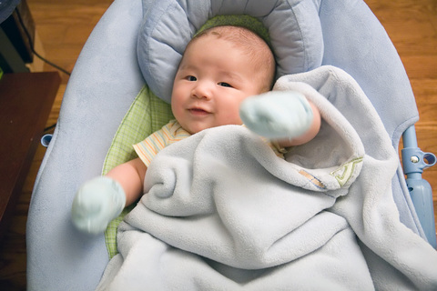 Normally we cover him up with a blanket when we put him in his bouncer but lately he's taken to kicking furiously when that happens so that the blanket slides off. All the while giggling happily. Apparently it's a big game to him. I'll keep covering him with the blanket and he'll just keep kicking it off with a smile on his face. It's funny as hell but I'm not going to be responsible if you catch a cold kid.