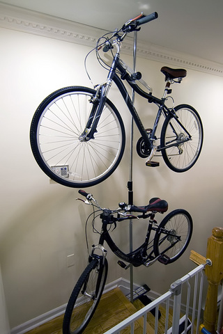 And the final headache that we had to deal with was figuring out a place to store the bikes. As I mentioned before, we have no garage and our interior space is limited so our original plan was to just chain the bikes to a railing outside or even on our balcony and throw a tarp over 'em during bad weather. That plan was eventually nixed because I figured even though the bikes were mostly aluminum/alloy and was thus more weather-resistant than if they were regular steel frames, there were still components that might be more quickly affected by prolonged exposure to the elements and moisture like the chain and brake lines and such. Another plan was to clear out as much of the storage area under our stairs to the second floor as possible and store the bikes in there. But I ruled that out because the storage area is relatively deep within our home and we'd have to trek the soon-to-be-dirty bikes through Devon's play area and our living room on a regular basis if we were to store them there.