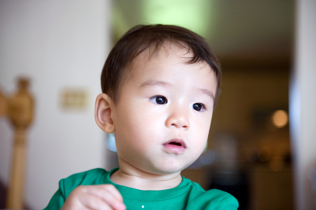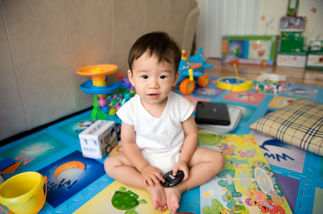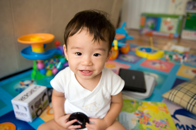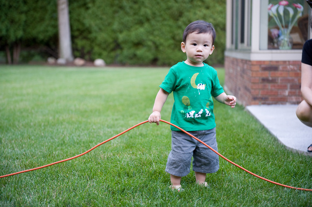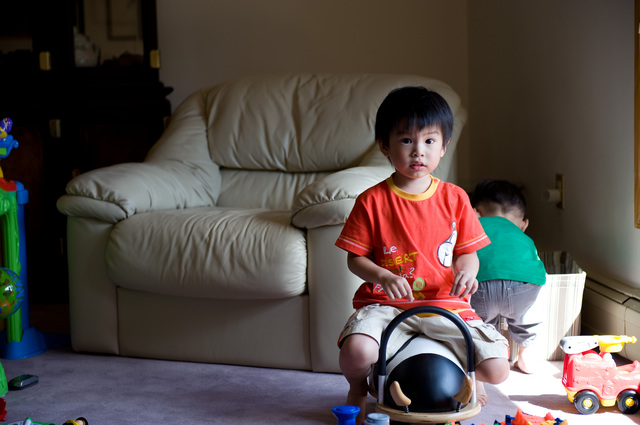 Devon, who pretty much ignores me these days when I'm taking photos of him, took an odd liking to the D700's shutter sound. I suppose because it was different from the 5D's that he's been hearing forever now. So the morning this shot and the following two below were taken was different because he would stare right into the lens with a goofy smile and then not move until he heard the shutter go click. Then he'd giggle and continue doing whatever he was doing.