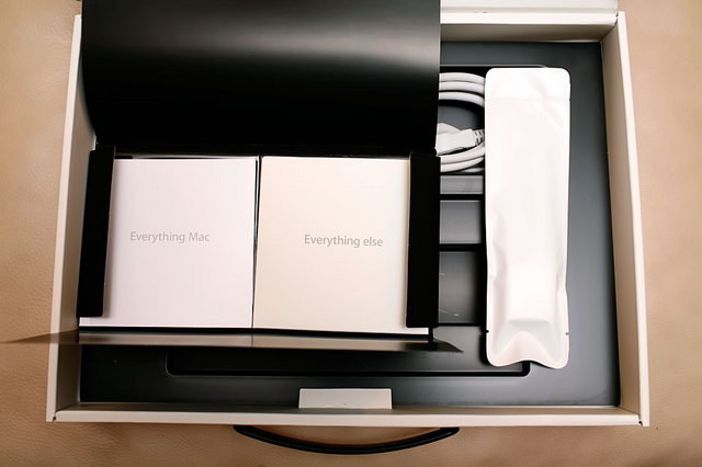 This is just a quick shot of the opened box that contains the documentation and discs and the DVI adapter is in that long white plastic packaging on the right. Apple seems to really like that type of packaging for their cords and accessories.