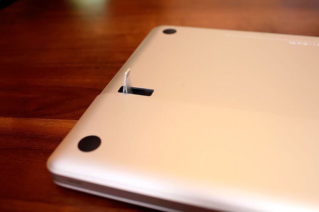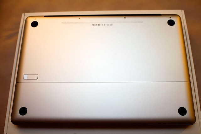 The bottom is a bit plainer than the previous MBPs as the battery is now situated under a thin aluminum cover. The footpads are now much bigger than before and in a first, are no longer just glued on to the bottom case. So no more lost footpads! The new footpads actually go through the bottom case and are held in position on the interior side because the piece inside is larger than the hole itself. However, the footpads are not as thick as before.