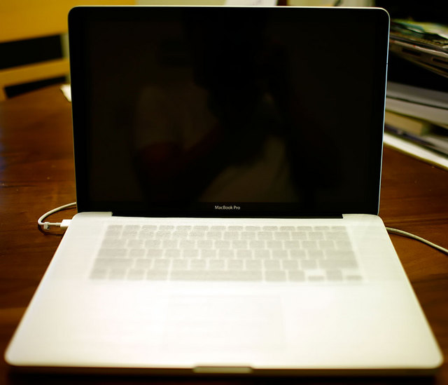 Raising the lid to the open position was pretty nice. The hinges aren't super stiff as it was in previous Powerbook G4 and MBP models where you had to keep a finger on the bottom case to keep it from rising with the top as it as being opened. One hand operation is now the norm. There's the typical white sheet covering the keyboard and staring at the screen is like looking at a miniature iMac screen. Black borders, all glass, all glossy.
