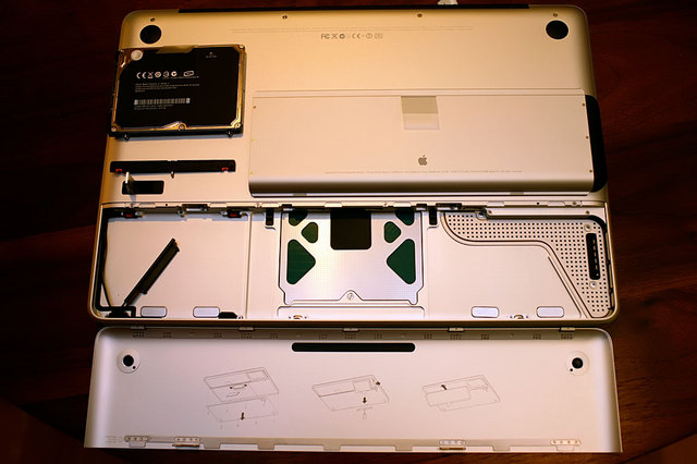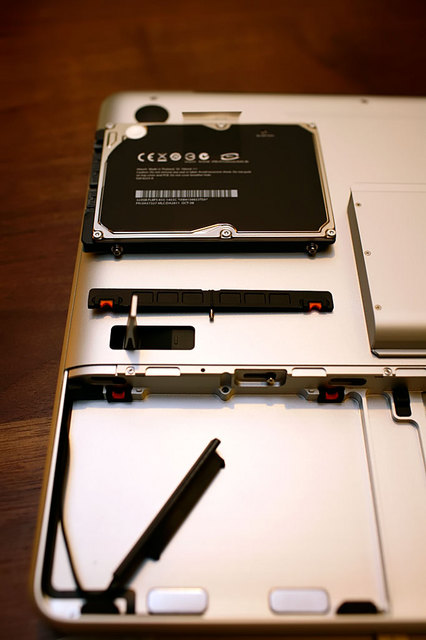 The hard drive is now easier to swap than the memory. One Phillips screw holds the drive down in place and again, a plastic tab taped to the side of the hard drive to help you pull it out. Once the hard drive is out, you just disconnect the SATA cable to completely remove the drive. However, you still need a Torx driver to remove the 4 hard drive mounts from the existing drive so that you can reinstall them on the new drive that you're putting in. You also may want to peel off the plastic tab and stick it on your new drive for future use. But peeling the tab off causes it to lose much of its stickiness so you can only do this so many times before it just doesn't stick anymore. Anyway, stupid easy compared to the old models where you had to unscrew like 20 screws all along the bottom and sides and then carefully pop up the the entire keyboard side of the case. Although I did that often enough to be able to swap drives in less than 10 minutes.