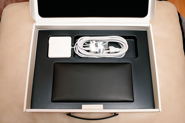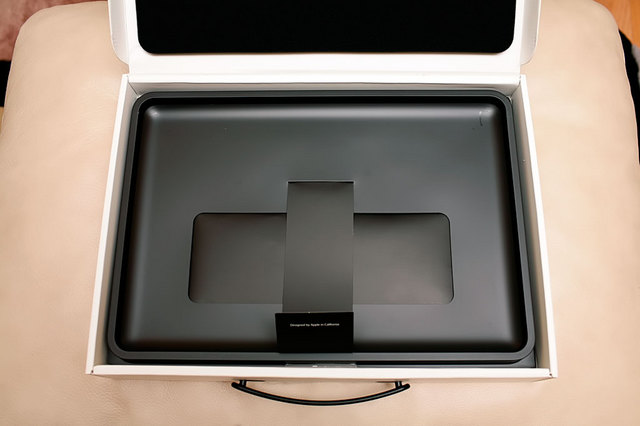 Here you see the tray that the MBP rests in along with the long tab that helps you pull it out. The black tray is very much like the tray in the iPhone packaging, just much larger obviously.