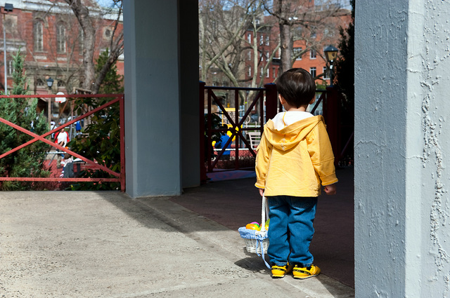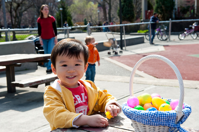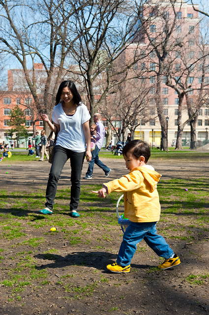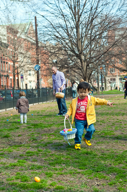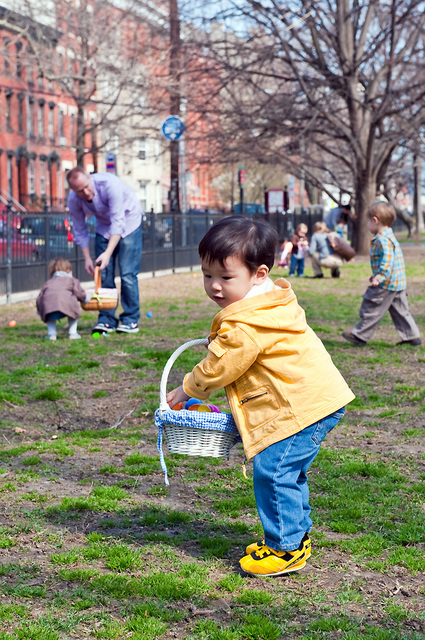 It didn't take him too long to figure out what he was supposed to do and with that, he was off! We'd lead him to egg-laden areas and he'd clean 'em out. Overall the pace wasn't all that hectic but it did wind down relatively quickly as kids can be pretty fast at gathering stuff. Which is why I mentioned that it was lucky that we arrived on time. If we were late by 15-20 minutes, the egg hunt itself would have already been over.