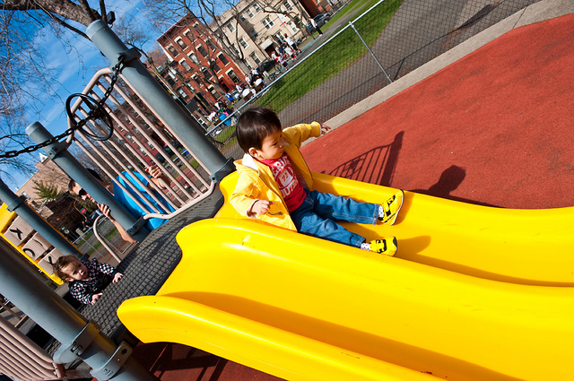 Then he relinquished his basket of eggs to Erin for a while so he can try out this new (to him) slide.