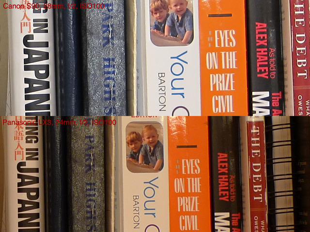 Right off the bat you can see one glaring difference between the two cameras. Namely, the S90 appears to handle tungsten lighting a lot better than the LX3. Noise is pretty much non-existent as it should be at ISO100. The S90 looks a bit sharper/cleaner though but not sure if that's because of the yellowish cast on the LX3 shot.