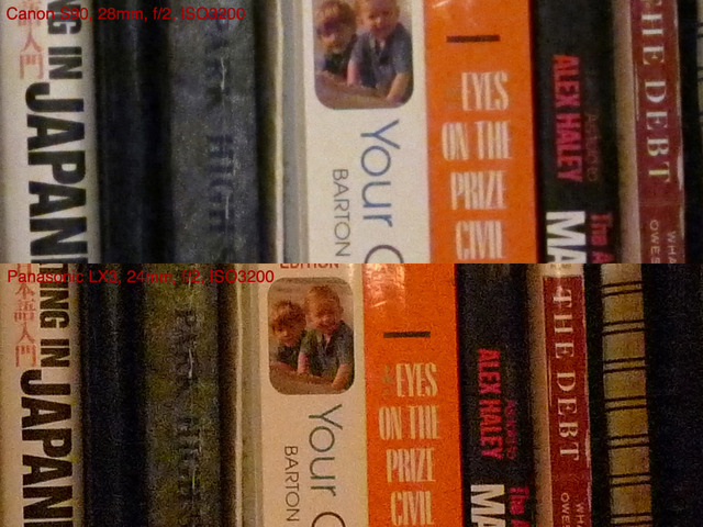 ISO3200 pretty much shows the same story. The S90 has some pretty effective noise reduction going on at the cost of sharpness. But I think it's a pretty decent balance they've done. I'll need to take some more test shots on subjects with finer detail to see how much is being lost in that regard.