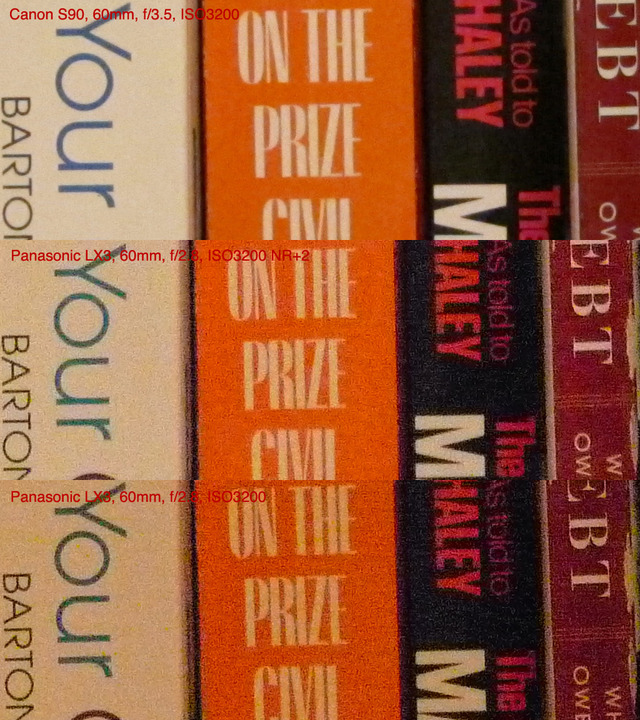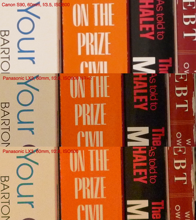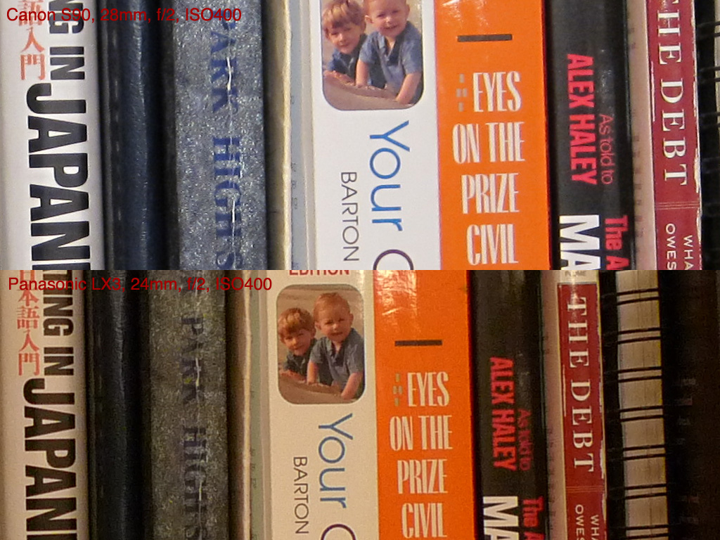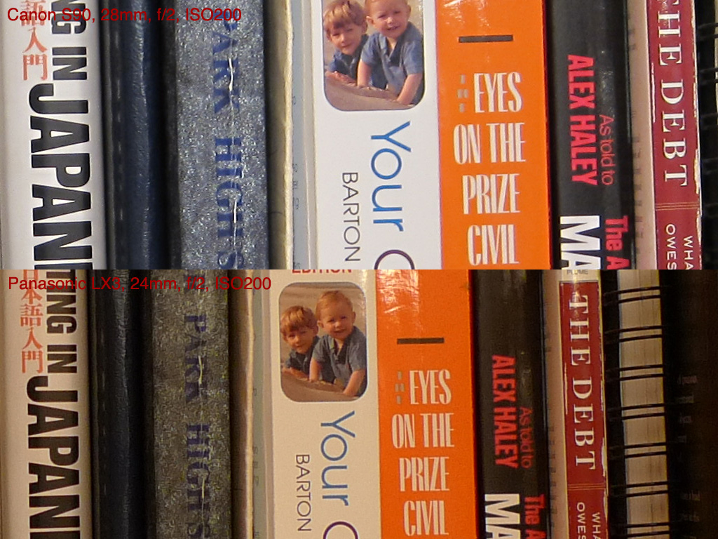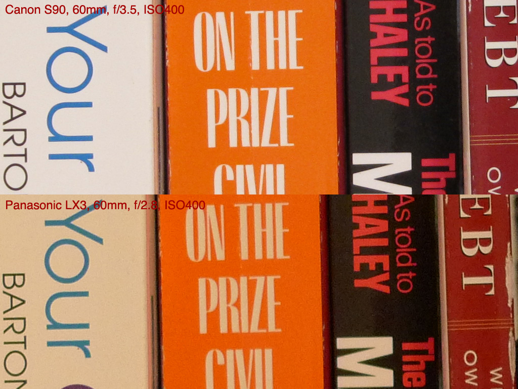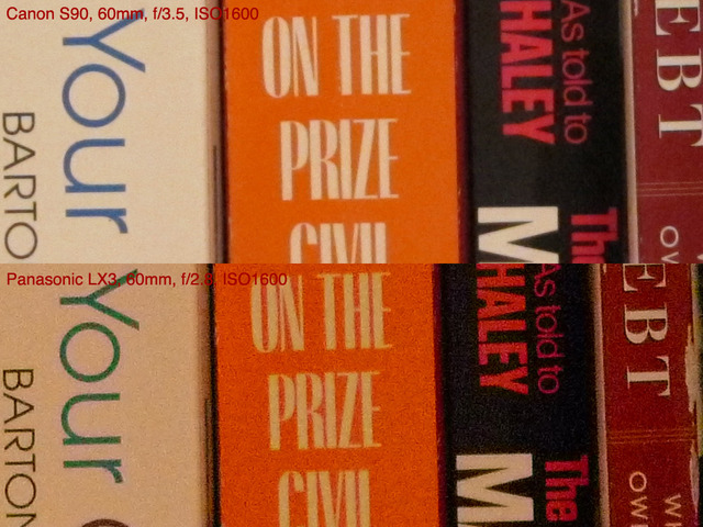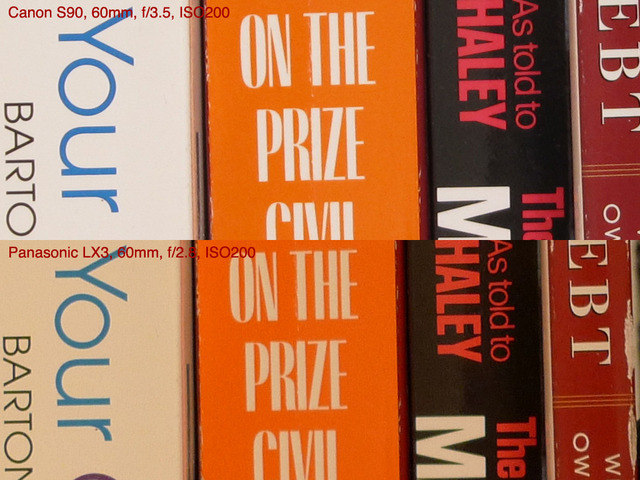 Moving on to test shots at the long end of the LX3's zoom range (60mm). For the S90 it's about halfway to its max zoom but by this time its max aperture is already one stop more than the LX3. Not that that will really make a difference I think. Long story short, the results here are pretty much the same as the test shots at the wide end. Of note is the continuous poor white balance performance under tungsten lighting that causes some color shift issues on the LX3.