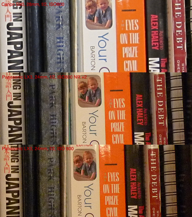 ADDENDUM: So, as requested, I took a couple of more sample shots with the LX3 but with its noise reduction cranked to the max. Previously, the LX3 shots were taken with the "Standard" picture style. This time, I still used the "Standard" style but bumped up the NR +2. As you can tell from the comparison shots below, it only makes a slight difference.