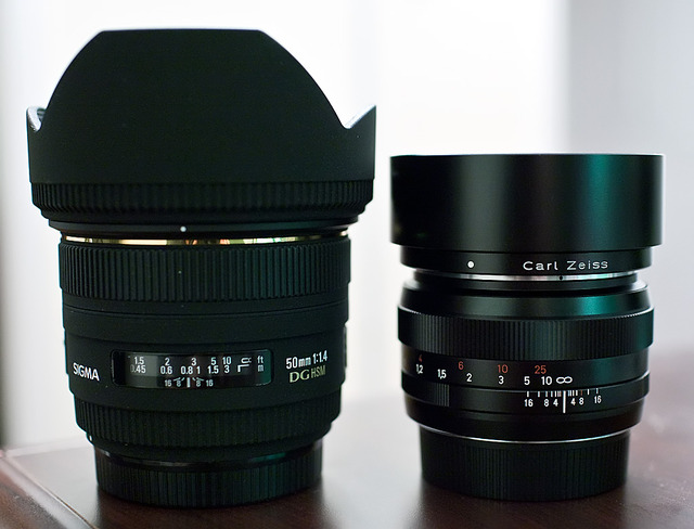 The first two to arrive are the Sigmalux (Sigma 50mm f/1.4) and the Zeiss Planar 50mm f/1.4 ZE. The Sigma is still a tank, large and well-built. Bokeh is still as creamy as ever but this particular copy seems to be a bit softer than I was expecting wide open. The Zeiss follows more along the lines of the Canon and Nikon 50mm f/1.4s in size except it's fantastically well-made with its all-metal body (even the hood is metal!). Its bokeh does not lose out much if at all to the Sigma and it does seem to be sharper wide open although kind of hard for me to tell at times because it's still tough to nail focus through the 5D2's viewfinder (even with the EG-S focus screen) at that large aperture. But I'm very impressed with it. I just wish it had autofocus. =\