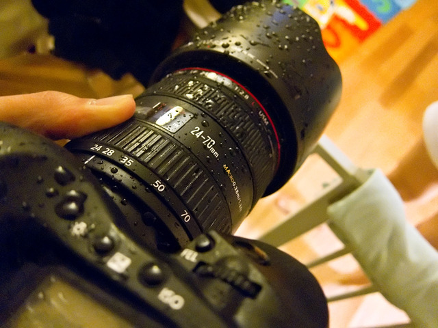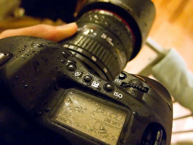 The above two shots I took after coming back inside and doesn't fully represent what the camera looked like while outside. It definitely took a nice shower out there for about a hour and a half. But after a quick towel off after coming inside, the camera was none the worse for wear. The only thing I had to do was go over the front element of the 24-70mm with a brush and Lenspen to clean off the moisture stains and residual dust. Heft-wise, I was pleasantly surprised. Overall weight with the 24-70mm wasn't too bad. I never thought it to be too heavy while in use. I expect this to be different though with a beefier lens like the 70-200mm f/2.8 IS. I bolted that on last night and yeah, it was a damn heavy combo.