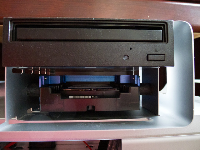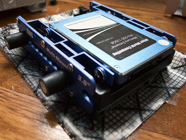 I've been using a 128GB SSD in my unibody MacBook Pro since early 2009 so I was well acquainted with the speed advantages. I was hoping that waiting another year+ would bring prices down but alas, that was not to be. The SSDs have gotten incrementally better but they're still locked in to the same price slots as before. The other issue was also where to install the SSD as all the internal bays were full. To that end I had been keeping an eye on the OWC Multi-Mount solution which provides brackets that allows you install combinations of 2.5" or 3.5" drives in the usually free second 5.25" bay that's situated under the optical Superdrive. So my grandiose plan was to pick up a Multi-Mount along with their 120GB Mercury Extreme Pro SSD and pair my existing Velociraptor to it. The SSD would become my sole MacOS X boot disc and the Velociraptor would be dedicated to Windows. I would also add a new 2TB Caviar Green drive to use as my Time Machine backup since that had also recently slipped under the $100 mark.