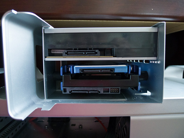 And voila, you slide the 5.25" bay back into place. The one drawback to all this is all the extra cables that you have to cram into the small area within the back of the 5.25" bay. It's a really tight squeeze and I wasn't 100% successful since you can see that the top right corner of the bay now sticks out a little bit. Doesn't affect functionality but again, less aesthetically pleasing. However, as I was typing up this post, I just realized that I could most likely remove one complete set of extension cables (the set that doesn't split the power into two) and still have the entire thing work. The reason MaxConnect needs that extra cable length is because if you use the mount that it comes with, the drives are placed side by side instead of stacked so the existing cables can't connect with that layout. But since I'm using the Multi-Mount instead, I could most likely do without the extensions.