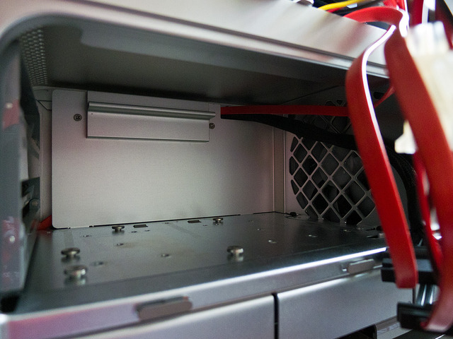 The above photo shows the back panel that I mentioned earlier that you have to remove first to be able to thread the SATA cable coming up from the PCI-e card into the 5.25" bay. Remember to put it back in before you finish up. I think it's primary purpose is just to keep the original cabling neat and hidden.