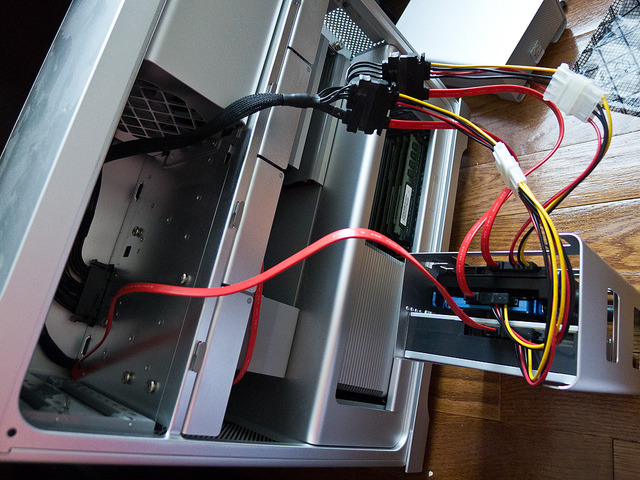 In the photo above, you can see the route the SATA cable takes from the PCI-e card to the 5.25" bays. While doing this installation it's easier if you remove the 1 and 4 3.5" hard drive bays as well as the entire 5.25" frame. There's also a thin back panel that you have to remove first from the far side of the 5.25" bay compartment before you can thread the SATA cable through. If you were really a stickler for aesthetics you could probably try to figure out a way to hide the SATA cable running across beneath the row of 3.5" bays but I'm perfectly fine with it hanging about like that.