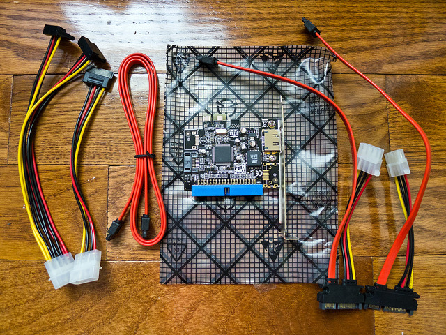 As seen above, the MaxUpgrades MaxConnect SZ-MPRO2509-04 kit comes with (from l. to r.): two power cable extensions, a SATA cable, a small PCI-e card, and two SATA extensions. Oh, and the aluminum disk drive mount which is not shown here since I'm not using it. Plus a CD containing installation instructions. Which, in my case was cracked so I wound up emailing their support for a PDF version that they emailed to me. A bit confusing at first but it all makes sense once you start connecting things.