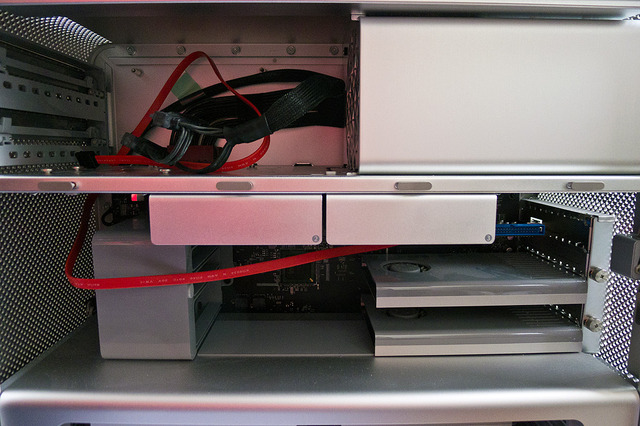 My price trigger when it comes to purchasing backup hard drives is $100. At the time of the Mac Pro purchase, that price slot was taken up by 1TB drives. When 1.5TB drives slipped below the $100 line, I bought one to use as a new Time Machine backup drive. At that point, all four of the Mac Pro's internal 3.5" hard drive bays were filled. I then replaced the 1TB data drive with a Seagate 7200RPM 2TB drive as I discovered 1TB wasn't quite enough to cover a year's worth photo & video. This setup worked quite well and remained unchanged until recently when I decided that it was time to bring a SSD into the fold.