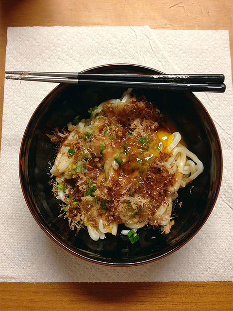 This particular recipe is definitely super easy. Doesn't even need the use of fire, just a microwave. For awhile I was hesitant to try it because I'm not a fan of raw egg. I know the idea is that the egg gets "cooked" a little bit when it comes in contact with the noodle when you're mixing everything together but since you don't really need to heat the udon up all that much, you're still pretty much eating raw egg. The only other issue I had when throwing this together is that I didn't defrost the udon noodles enough before microwaving them. So the udon was still stuck together afterwards and broke apart into chunks instead of individual strands.