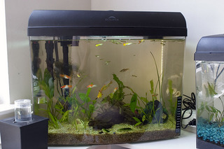 Using it as a breeder tank for now. Moved back the black female guppy that Erin swears is pregnant (and who has given birth to 4 fry so far in the last month or so) along with her 2 most recent fry. I think I'm gonna try to get away from guppies as much as possible now. May keep maybe a pair for Erin but no more.