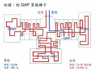 For those who don't read Chinese, the image is a generic layout of a mall. Guy's path in blue, gal's path in red. Objective is to buy a pair of pants from the Gap. Men complete the task in 6 minutes and spend ~$25. Women take about 3.5 hours and spend ~$570. | |